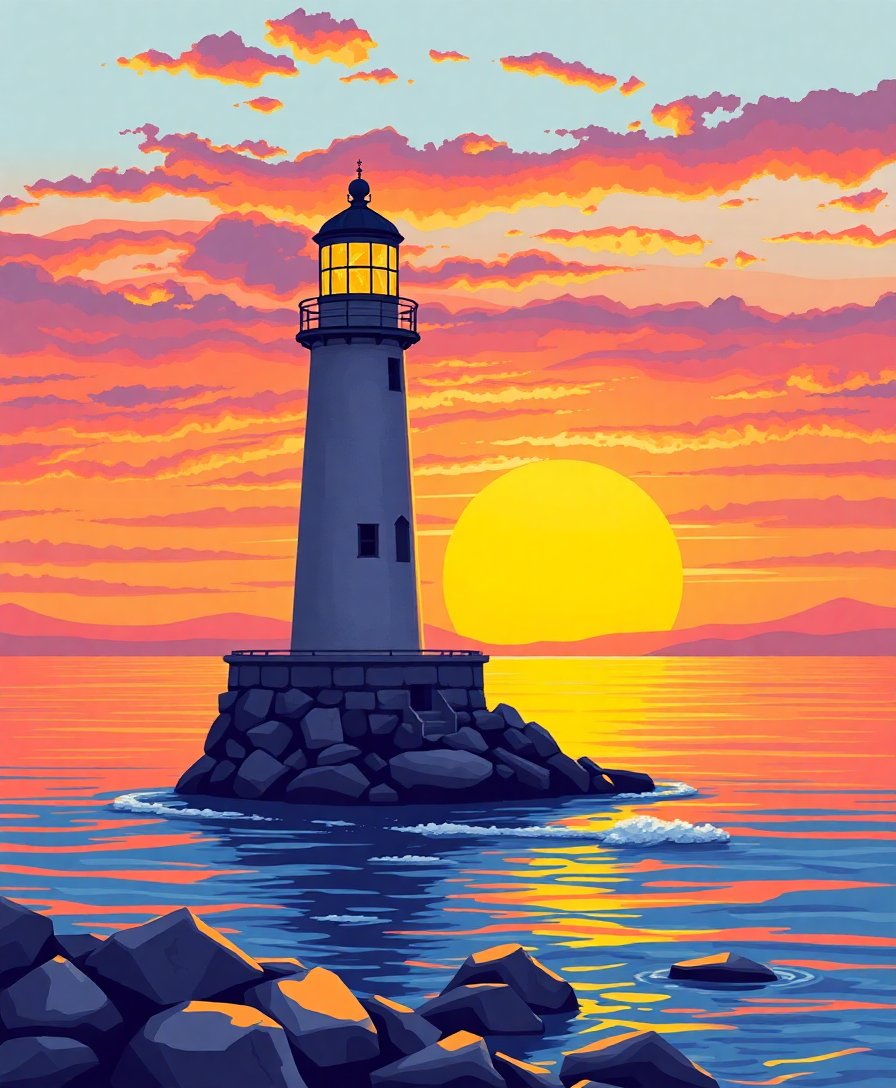 Ultimately, step back and admire your glowing island beacon masterpiece. Additionally, the vintage architecture and realistic water create stunning visual depth. Your completed artwork radiates warmth and coastal charm.