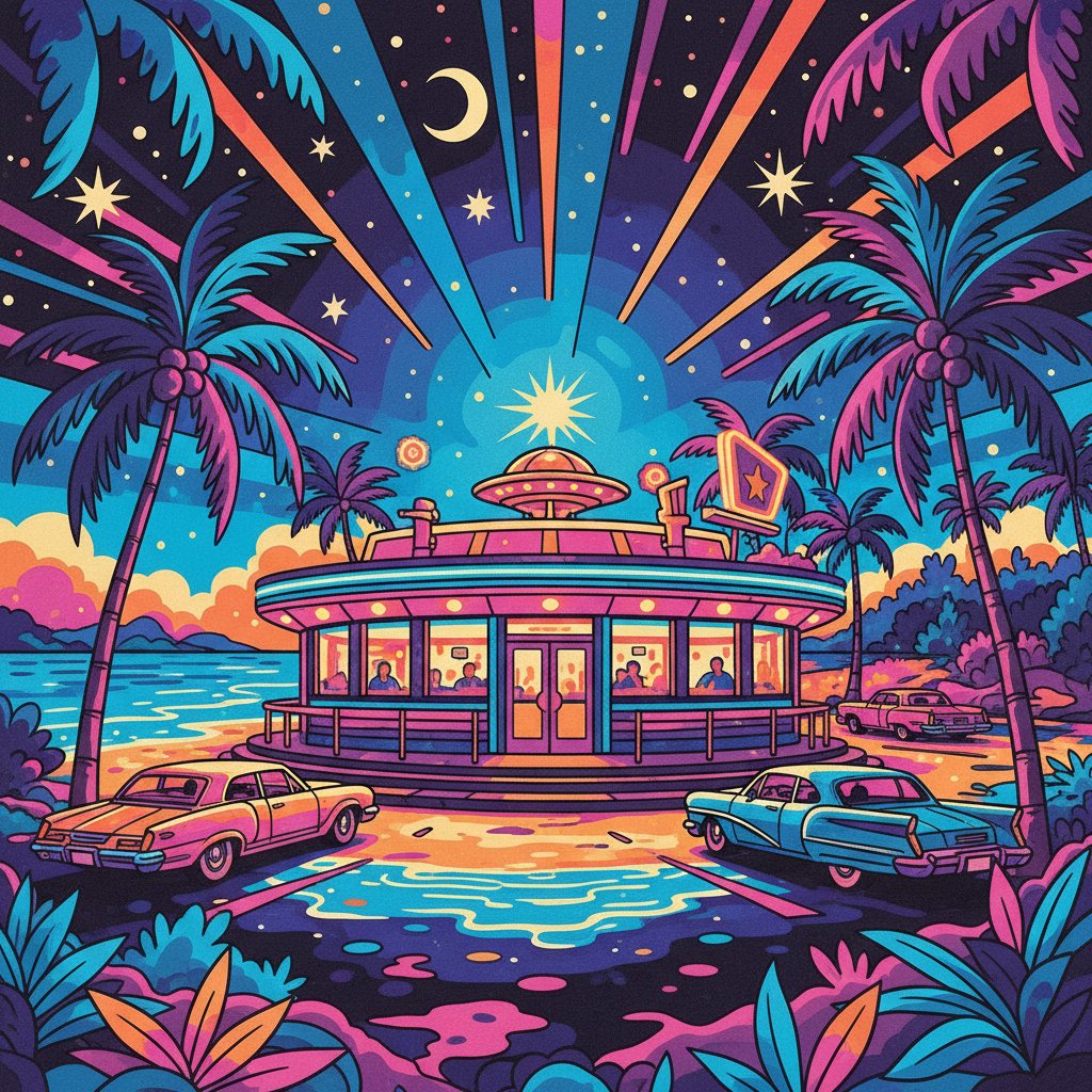 The neon lighting effects and evening atmosphere create a unique retro ambiance. The realistic details capture the nostalgic charm of classic island diners perfectly.