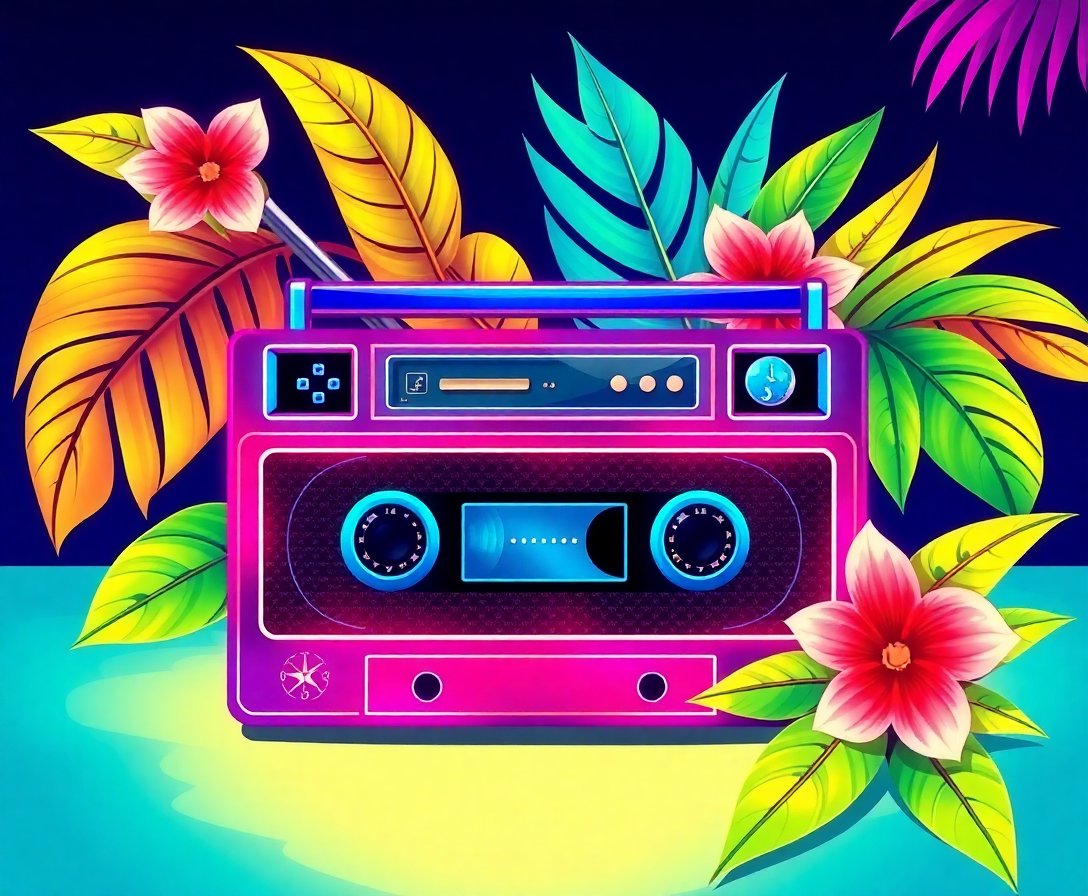 The design features vibrant colors that create a glowing effect visually, especially the tropical and neon elements. The finished piece captures that luminous cassette player aesthetic perfectly.