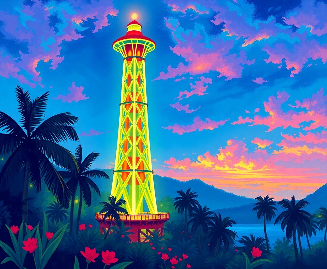 Ultimately, step back and admire your completed tropical impressionist masterpiece. The glowing tower stands majestically against verdant foliage. Your artistic achievement deserves prominent display in any room.