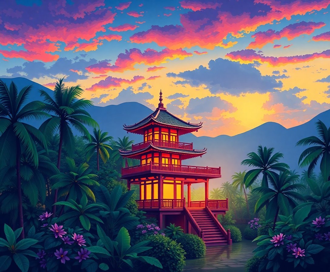 Therapeutic Benefits of This Glowing Tropical Pagoda Dusk Paint By Numbers