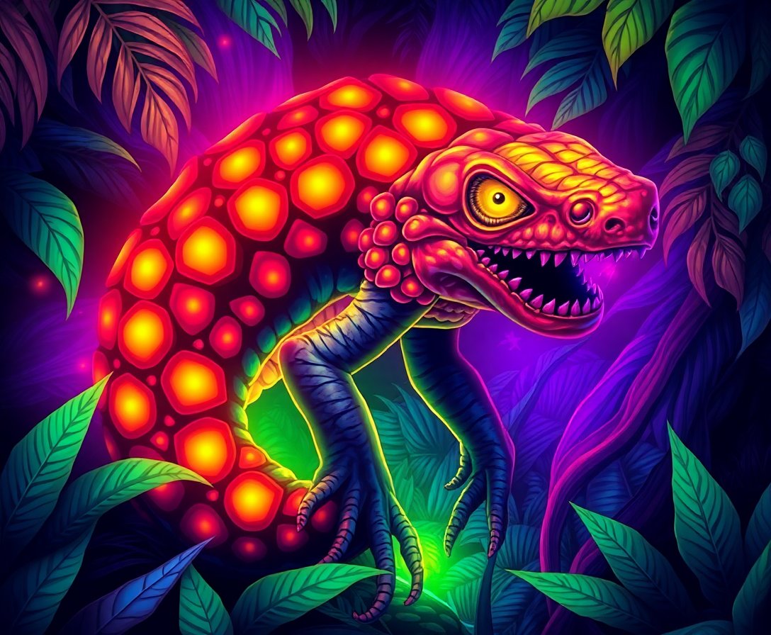 The glowing effects are achieved through special paint formulations that create luminescent highlights and depth. The tropical creature appears to shimmer with mystical energy.