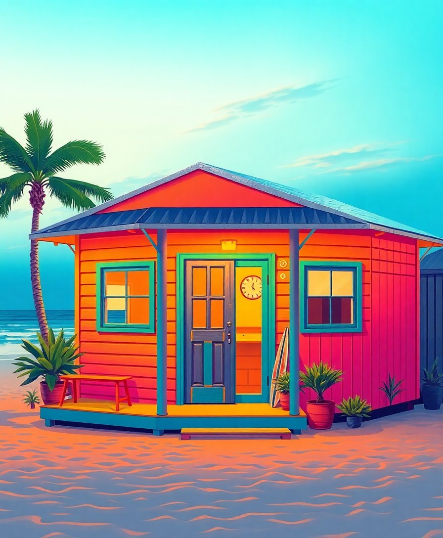 Transform your space with this captivating beach coastal artwork that brings vintage charm to life. This Glowing Vintage Beach Hut Paint By Numbers kit captures the nostalgic beauty of retro surf culture through warm golden light and realistic details.