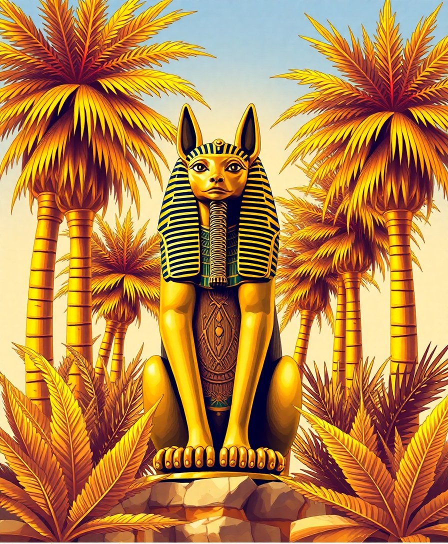 Ultimately, step back and admire your completed masterpiece. The golden hues and palm fronds create a shrine-like atmosphere. Your finished artwork radiates the timeless beauty of Gilded Egyptian Antiquities.