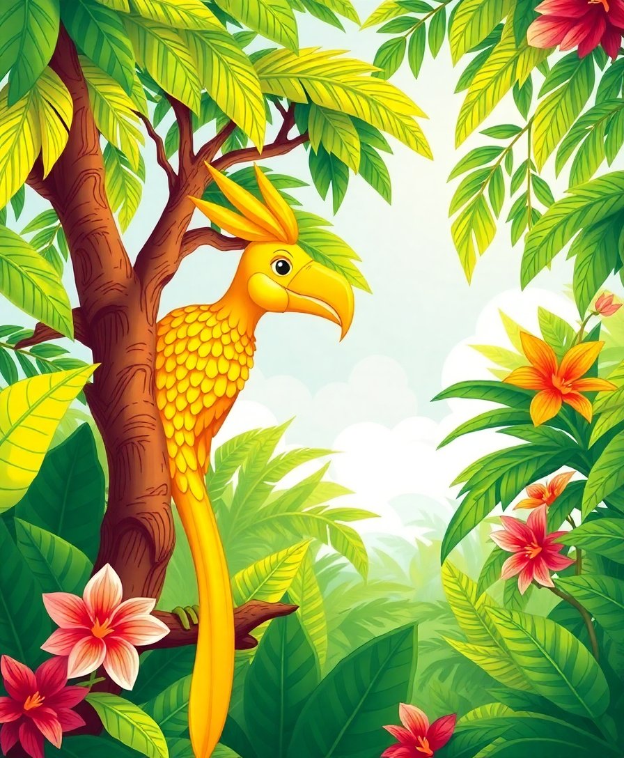 The tropical canopy setting combined with warm sunset colors creates a magical atmosphere. Additionally, the heroic character adds classic storybook charm to your finished artwork.