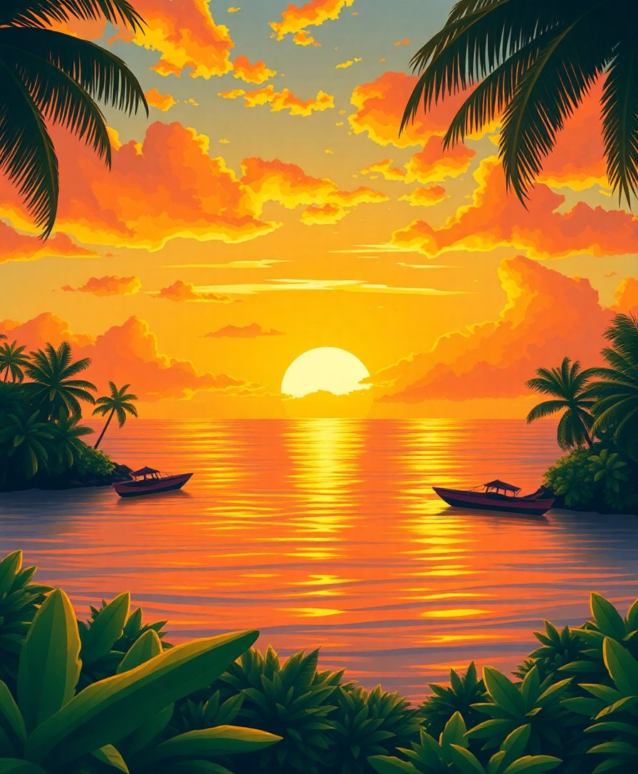 Ultimately, step back and admire your completed tropical coastline masterpiece. Therefore, the golden hour glow radiates warmth throughout your room. Your finished artwork captures the serene beauty of Tropical Horizon Sunsets perfectly.