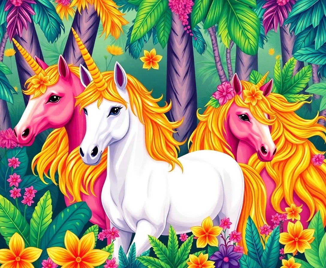 The Golden Tropical Unicorn Herd design stands out among fantasy artwork options. Specifically, the warm palette creates stunning visual impact. Moreover, the detailed unicorn herd scene challenges and inspires painters of all skill levels.