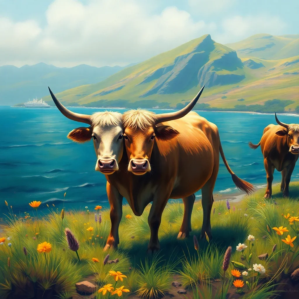 Ultimately, step back and admire your completed pastoral scene. The finished piece showcases peaceful cattle against scenic island landscapes. Display your artwork proudly as a testament to your creative journey.