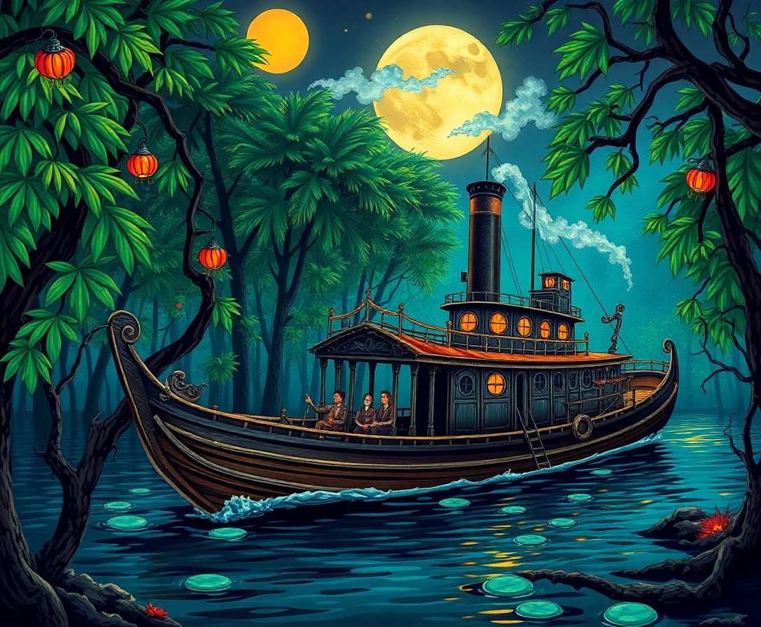 The unique combination of tropical mangroves with vintage steamboat creates an atmospheric Halloween piece. The foggy, macabre setting offers a sophisticated alternative to traditional Halloween artwork.