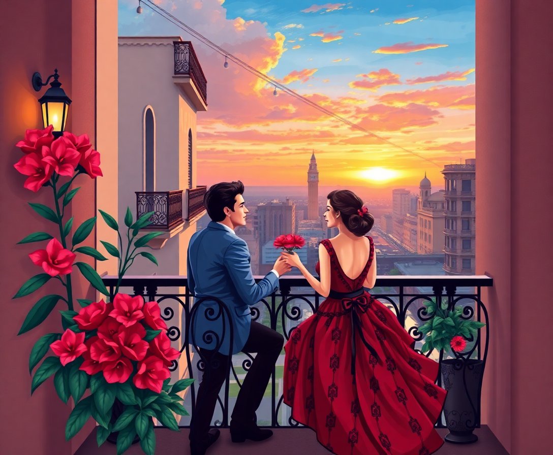 Ultimately, step back and admire your finished masterpiece. The sunset hues and intimate balcony setting create a captivating focal point. Your completed artwork becomes a cherished reminder of creative accomplishment and romantic beauty.