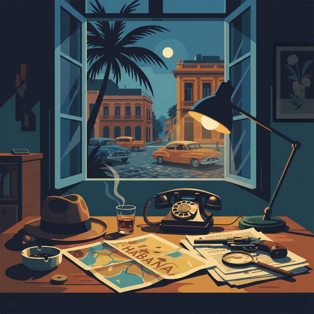 This unique design celebrates the golden era of detective fiction with authentic period details. Additionally, the sophisticated color palette captures the smoky ambiance of 1940s Havana perfectly. Furthermore, the finished artwork makes an excellent conversation piece for any room.