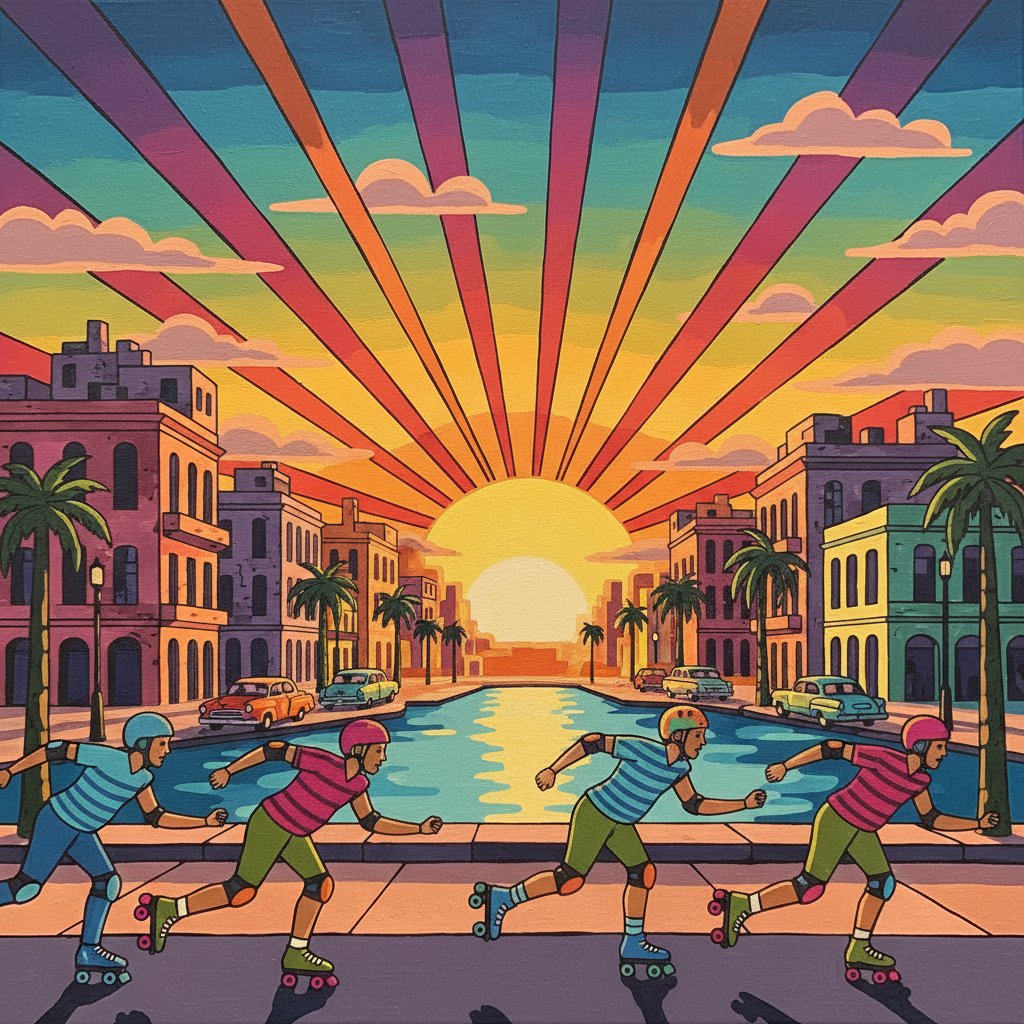 Transform your space with vibrant tropical energy through this captivating Havana Sunset Skate Race Paint By Numbers masterpiece. This dynamic artwork captures the electric atmosphere of vintage roller disco culture against a stunning tropical sunset backdrop.