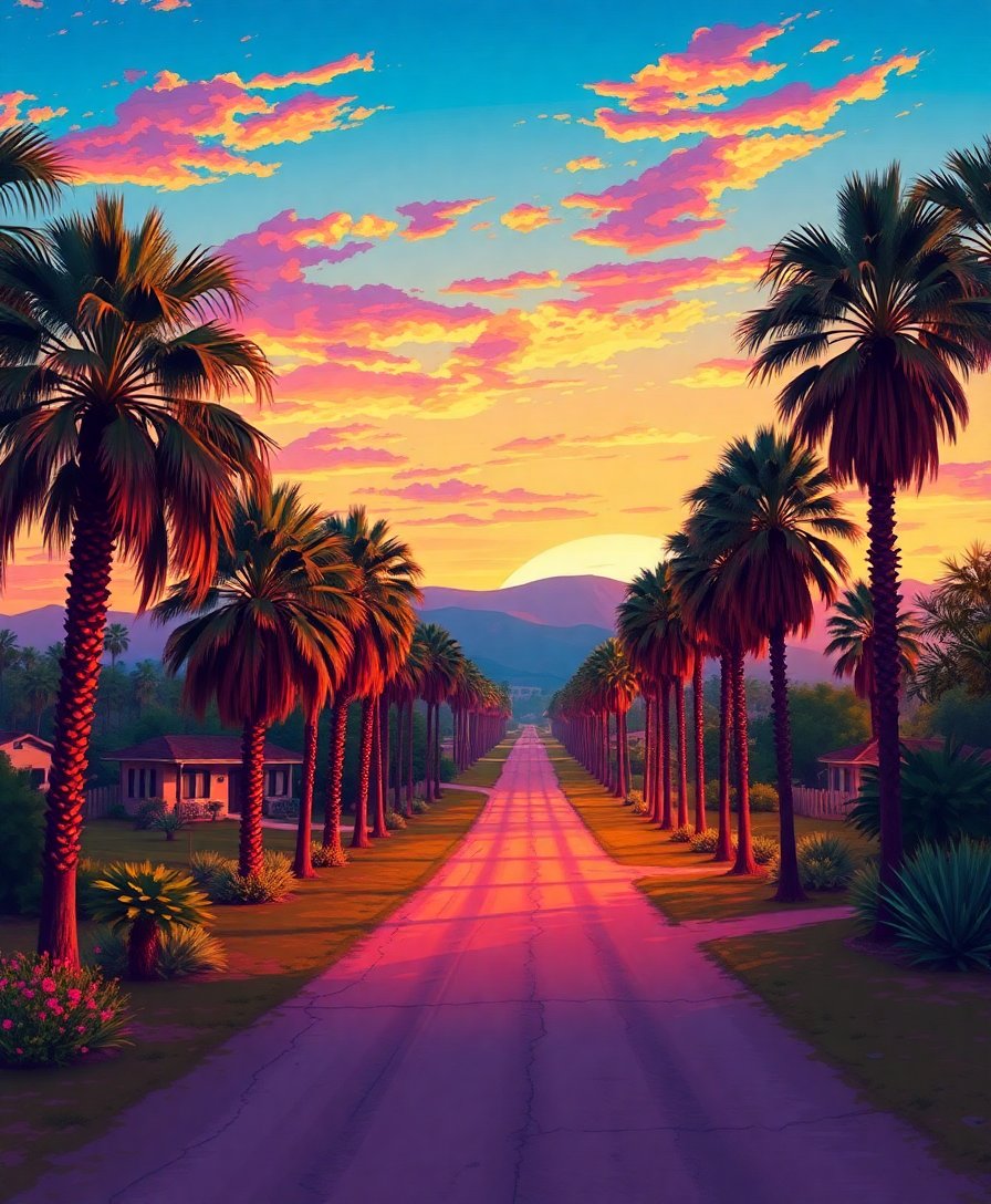 Ultimately, add final details to complete your nostalgic palm avenue. Allow each section to dry completely before moving to adjacent areas. Step back frequently to admire your progress and artistic achievement.