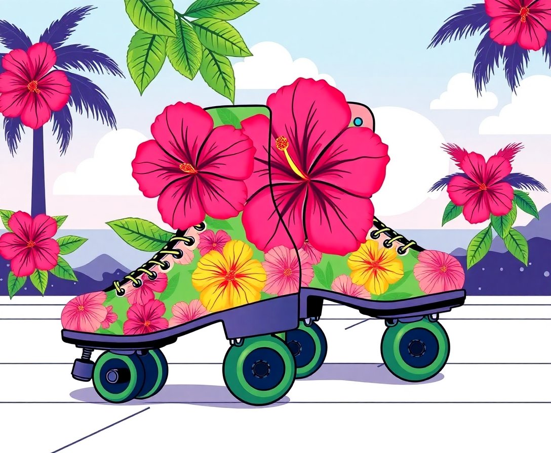Ultimately, step back and admire your completed tropical roller disco masterpiece. The hibiscus blooms and retro skates create a stunning visual harmony. Furthermore, your finished artwork brings nostalgic charm to any room.