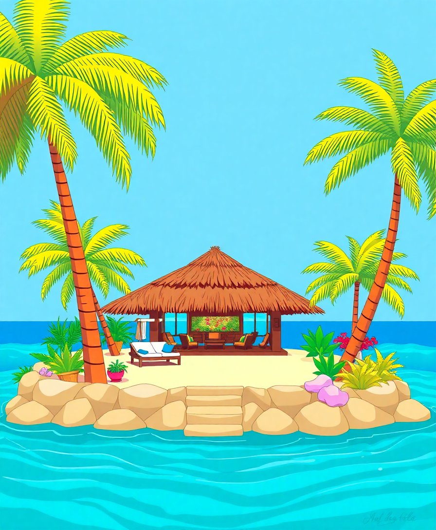 Ultimately, step back and admire your completed tropical masterpiece. Furthermore, the finished painting captures the serene beauty of your island hideaway. Additionally, display your artwork proudly as a reminder of this relaxing creative experience.