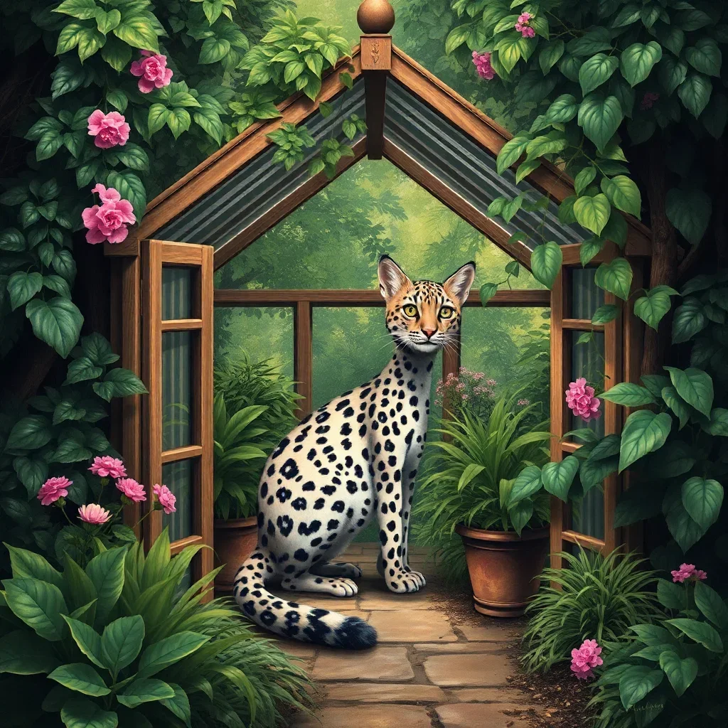 The standard canvas measures 16×20 inches, providing ample space to showcase the intricate greenhouse details and mysterious ocelot. This size displays beautifully in most home settings.