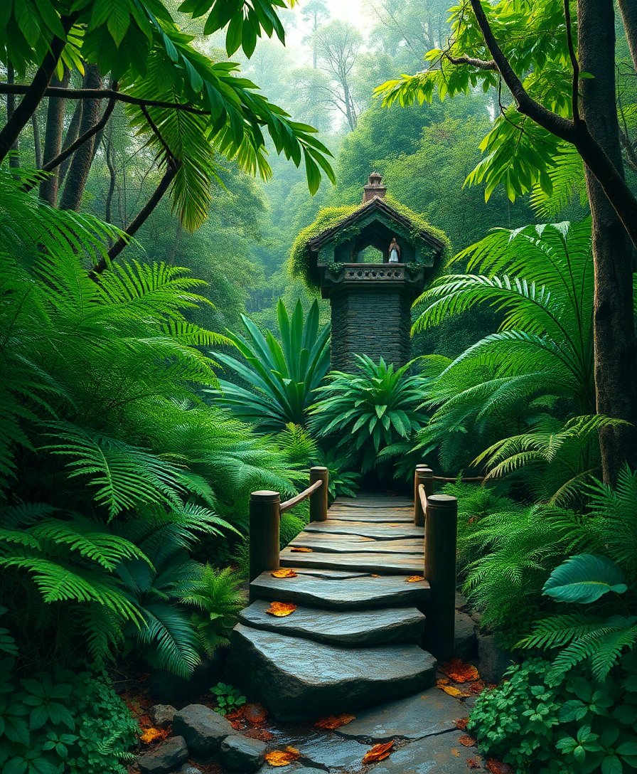 Ultimately, complete the finest details to bring your rainforest scene to life. Allow each section to dry completely before moving forward. Your finished artwork will showcase stunning tropical greenery and peaceful stone crossing elements.