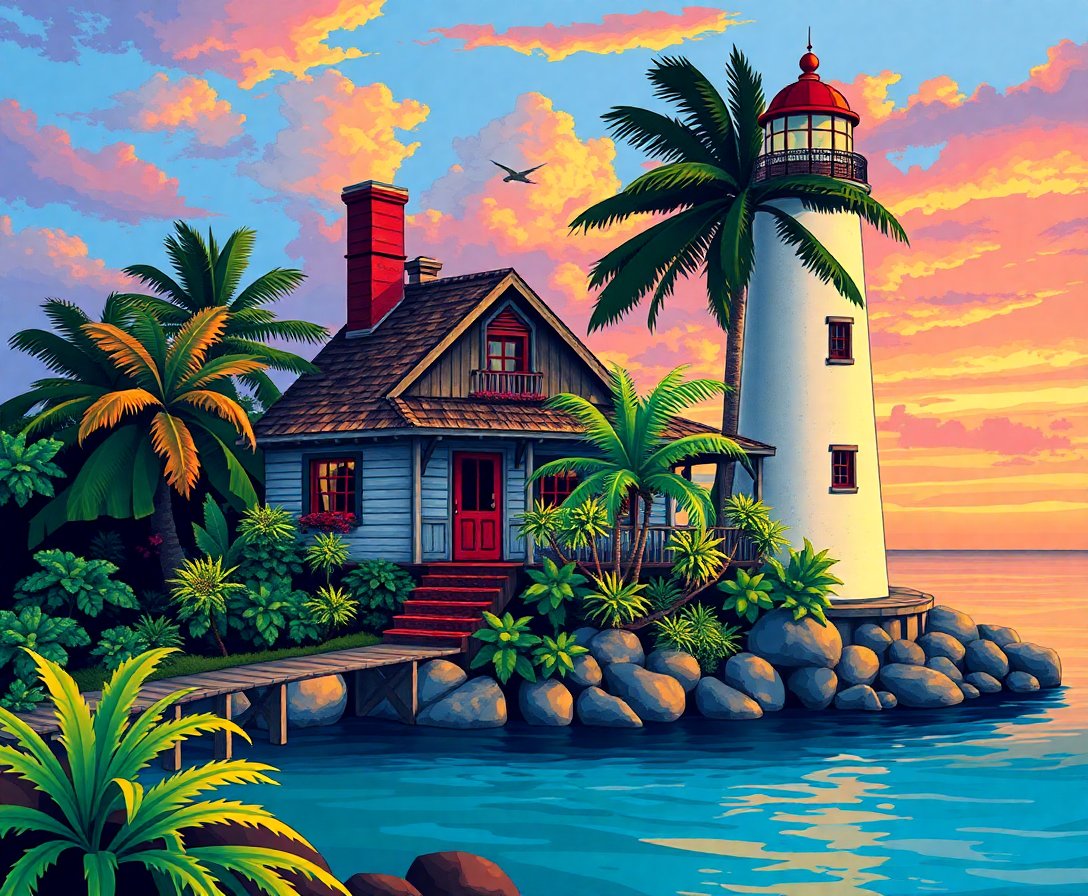 Embrace the tranquil beauty of this tropical cottage scene. Whether gifting or personal enjoyment, this kit delivers hours of creative fulfillment. Start your artistic journey today and discover the joy of mindful painting.