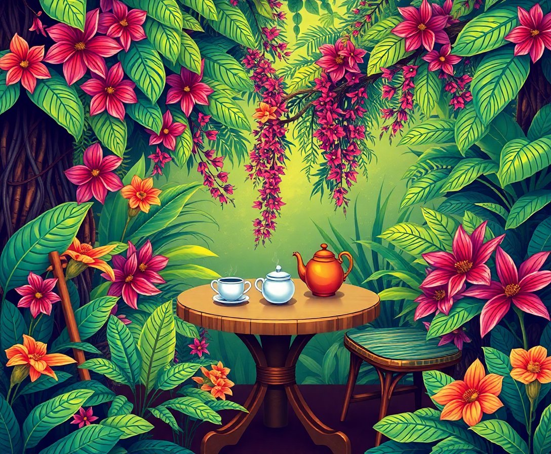 This unique design combines vintage teacups with lush banana leaves, creating a sophisticated blend of botanical and cozy indoor themes. The realistic details and tropical elements make it a standout piece for any room.