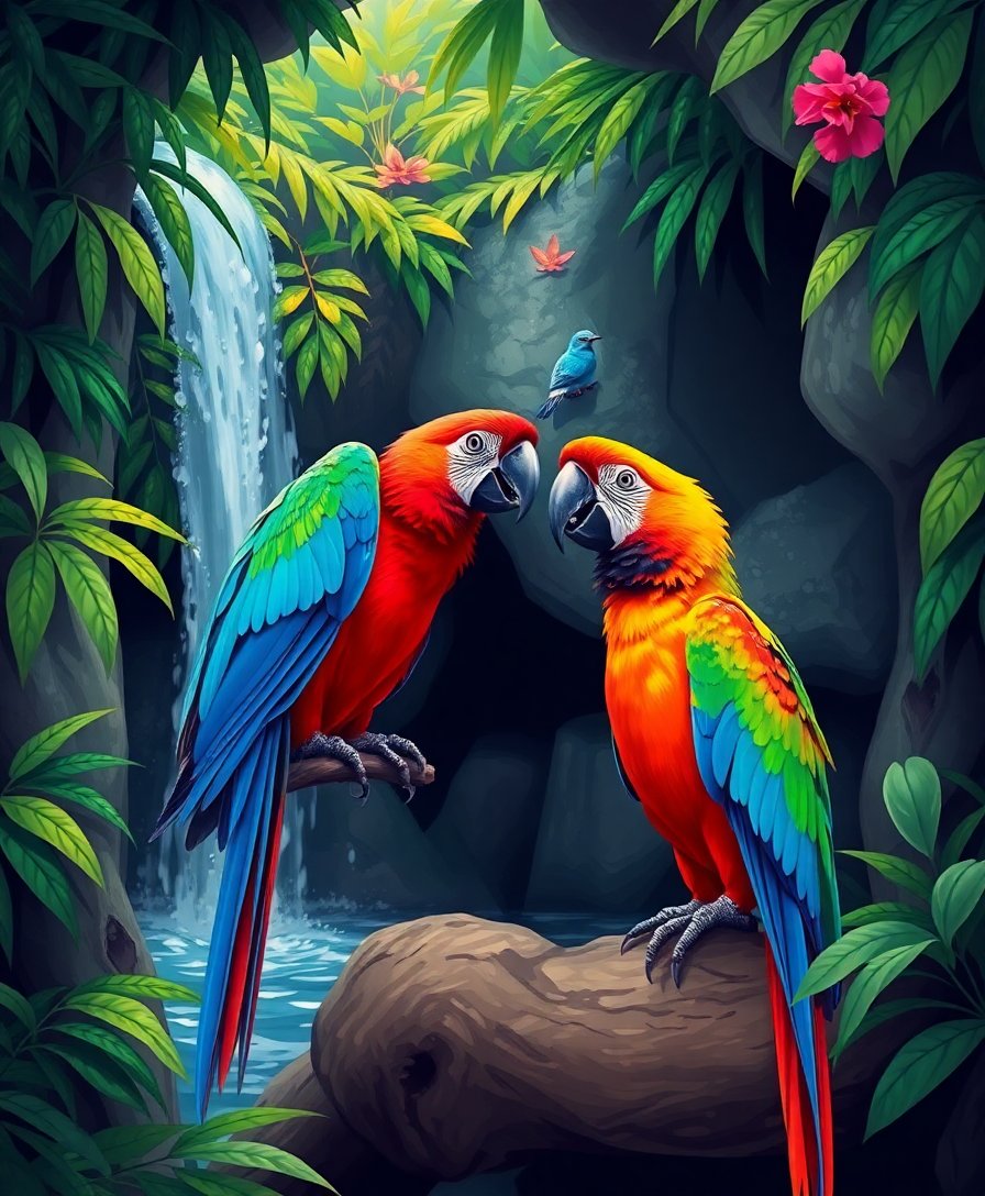 Ultimately, add final touches to create depth in your hidden waterfall scene. Moreover, step back and admire your completed masterpiece. Your bathing macaws now grace your wall beautifully.