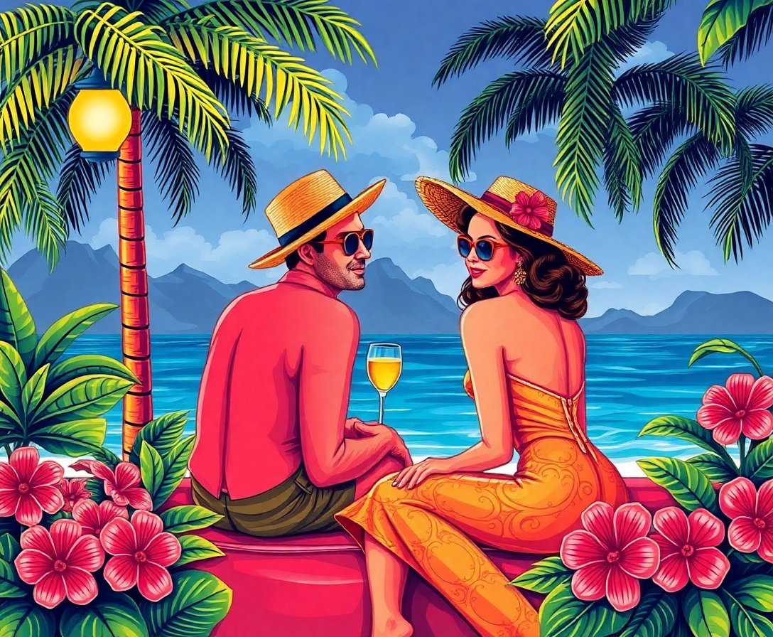Ultimately, add final details with your smallest brush. These finishing touches bring depth and character to your tropical scene. Your completed artwork radiates old Hollywood charm and nostalgic romance.