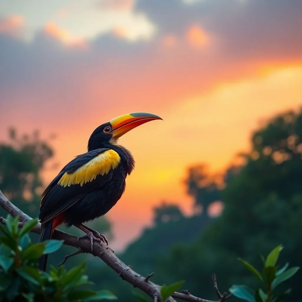 Finally, apply the finishing touches to the hornbills’ distinctive beaks and plumage details. Consequently, your completed masterpiece will showcase these majestic tropical birds in all their evening splendor.