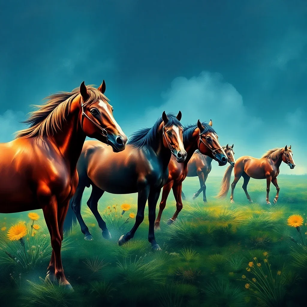 Ultimately, add the final details with your smallest brush to capture the horses’ expressive eyes and flowing manes. Step back and admire your completed masterpiece as it embodies the atmospheric drama of the approaching storm.