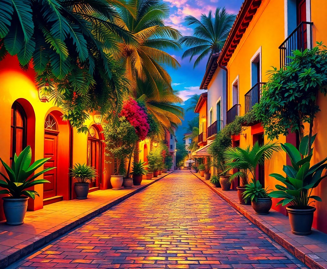 Transform your artistic journey with this captivating Illuminating Tropical Cobblestone Alley Paint By Numbers masterpiece. This enchanting nightfall scene combines tropical warmth with architectural elegance, creating a mesmerizing artwork that brings exotic charm to any space.