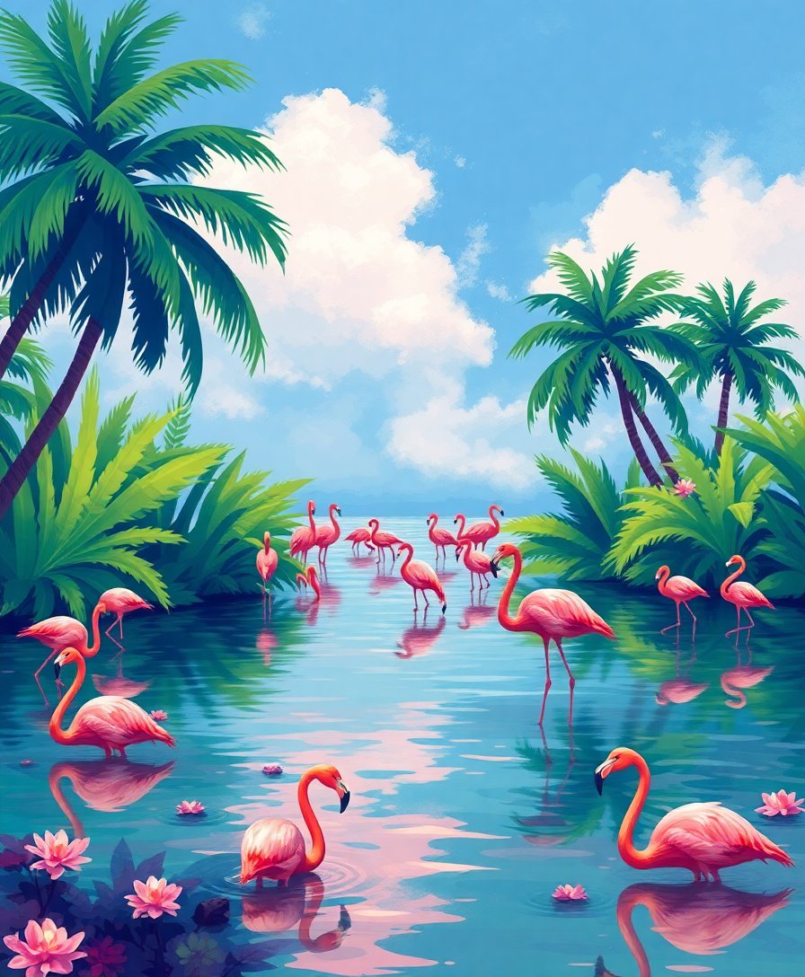 Ultimately, step back and admire your completed tropical paradise. The final brushstrokes reveal stunning pink flamingos reflected in tranquil lagoon waters. Your Impressionist techniques have created a breathtaking landscape worth displaying proudly.