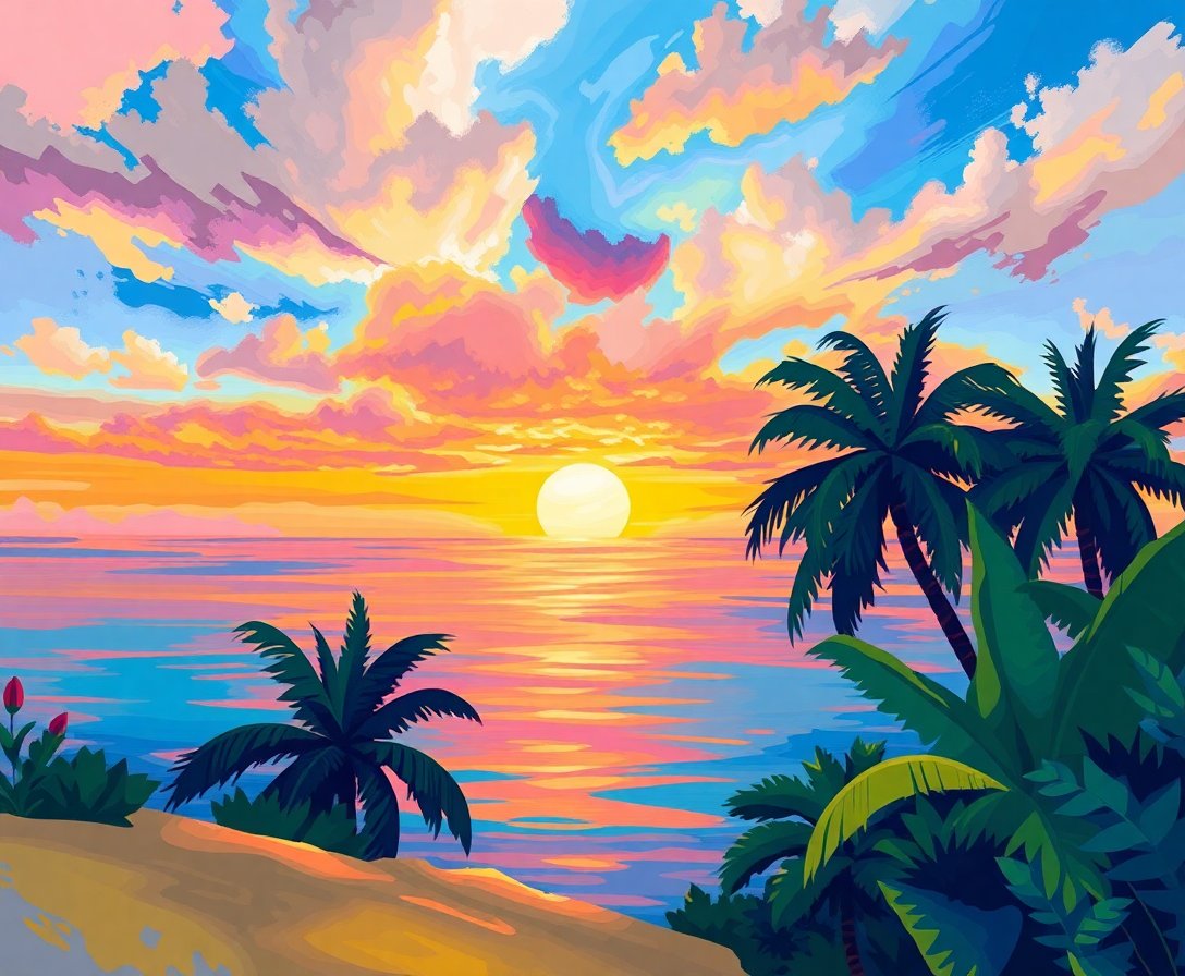 Transform your home with this captivating impressionist landscape today. Subsequently, experience the joy of creating your own tropical paradise masterpiece.