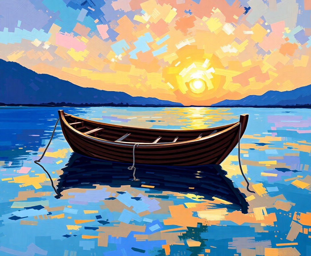 Ultimately, step back and admire your completed seascape. Furthermore, the turquoise waters and gentle rowboat create a peaceful focal point. Additionally, your finished piece brings impressionist techniques to life in your home.