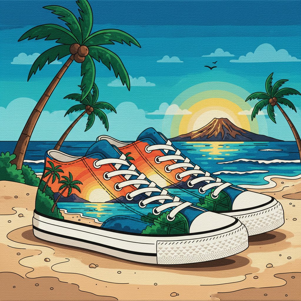Transform your artistic vision with this captivating Island Bound Vintage Sneakers Paint By Numbers design. This nostalgic kit perfectly blends streetwear culture with stunning ocean sunset imagery. Moreover, each numbered section guides you through creating your own retro sneaker masterpiece.