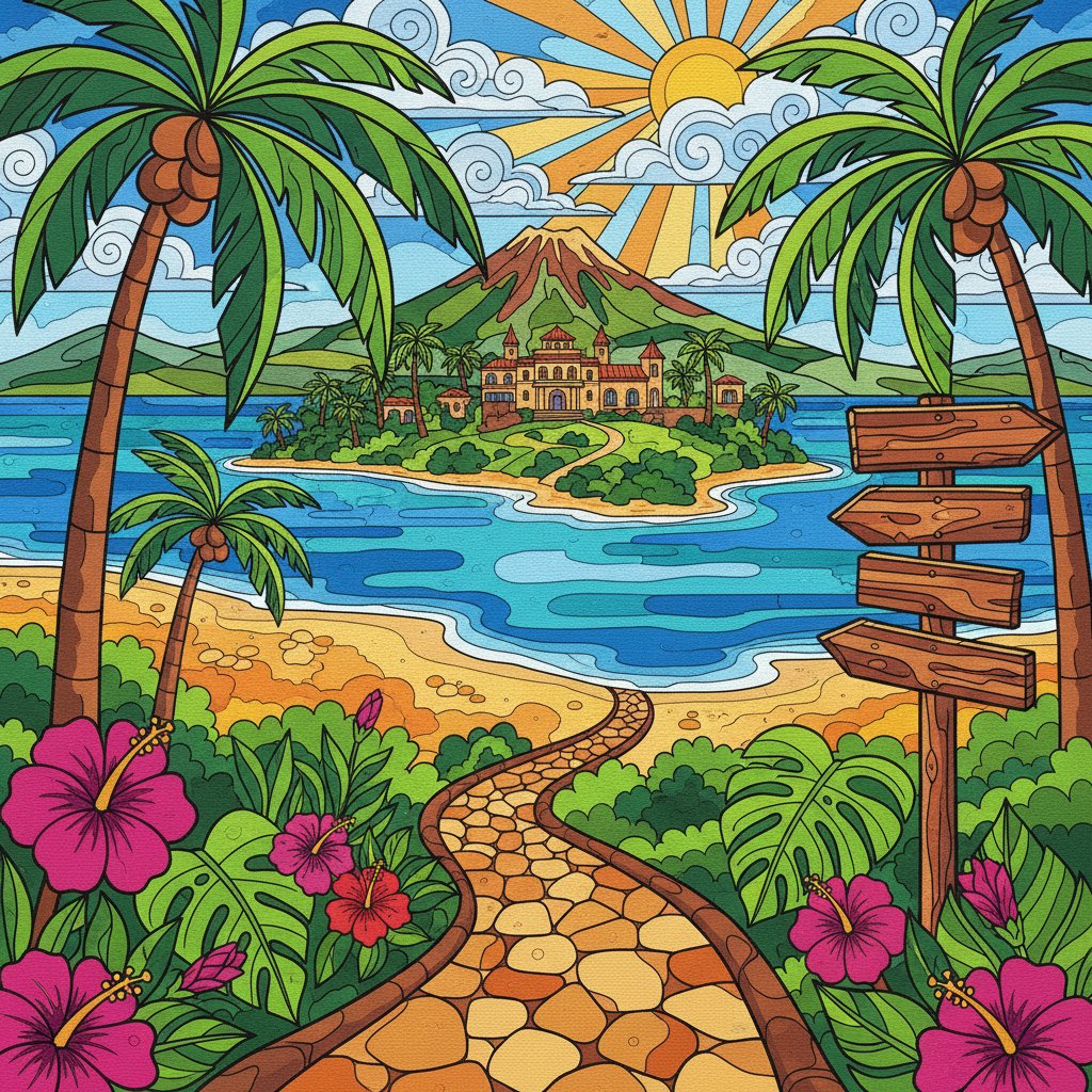 Transform your space with the captivating Island Estate Signpost Path Paint By Numbers, a stunning tropical landscape that brings paradise directly to your wall. This remarkable kit captures the essence of a sun-drenched estate pathway lined with swaying palms and bathed in golden sunlight.