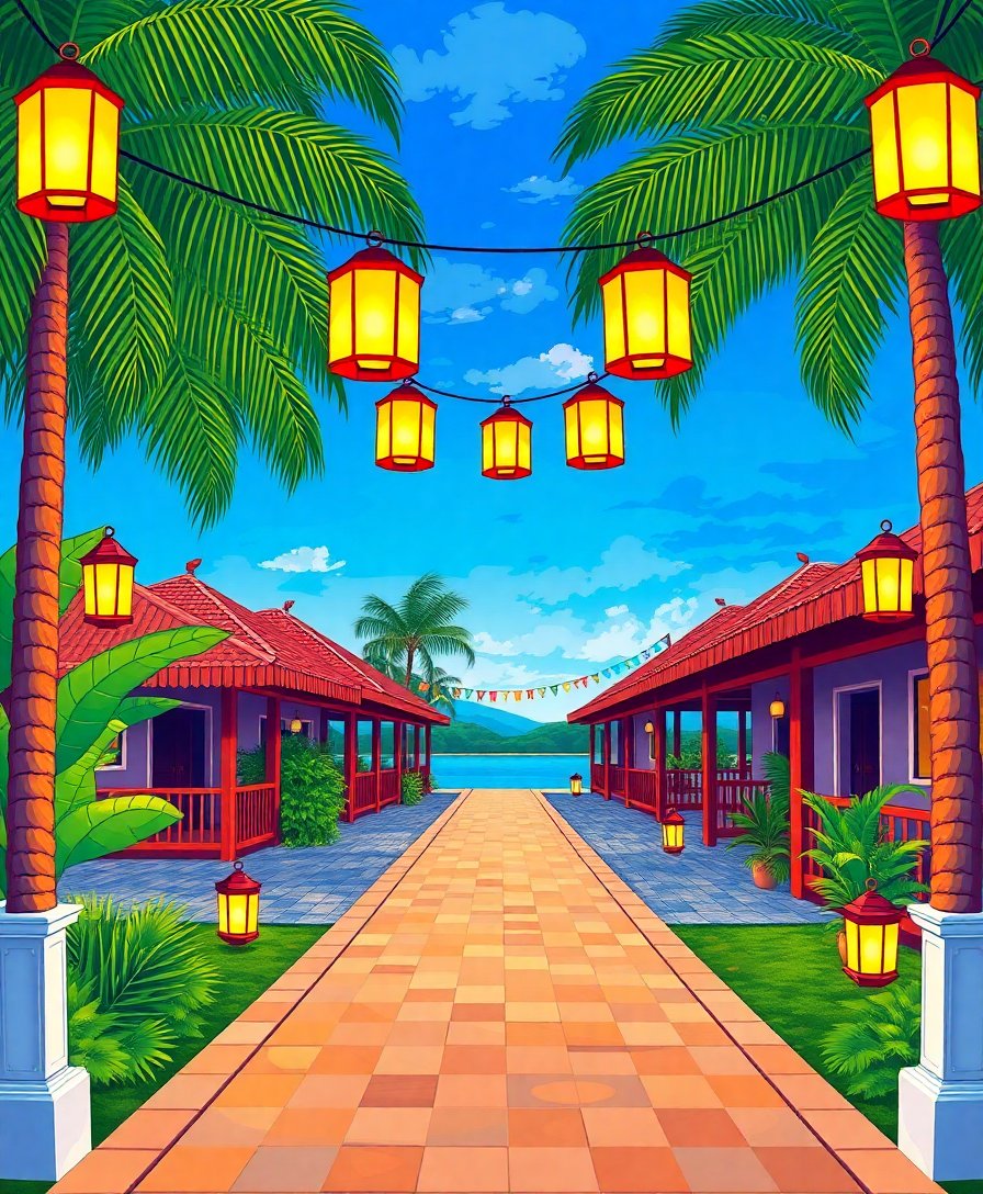 Ultimately, step back and admire your finished tropical masterpiece. Add final touches to enhance depth and vibrancy. Your completed artwork showcases the serene beauty of illuminated resort pathways under starlit skies.