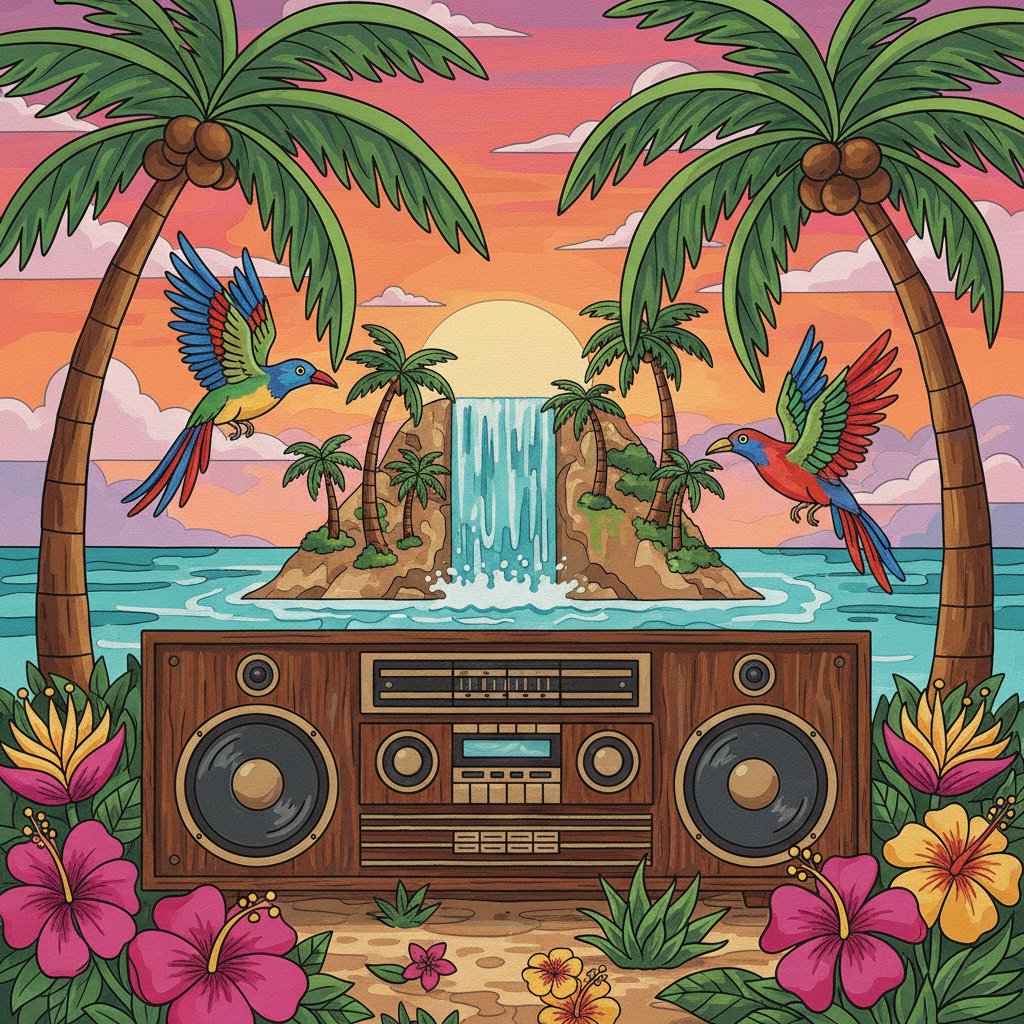 Transform your creative space with this captivating Island Rhythm Stereo Setup Paint By Numbers design. This tropical-inspired masterpiece combines vintage music culture with sunlit island vibes, creating an artistic journey that celebrates the golden age of vinyl and turntables.
