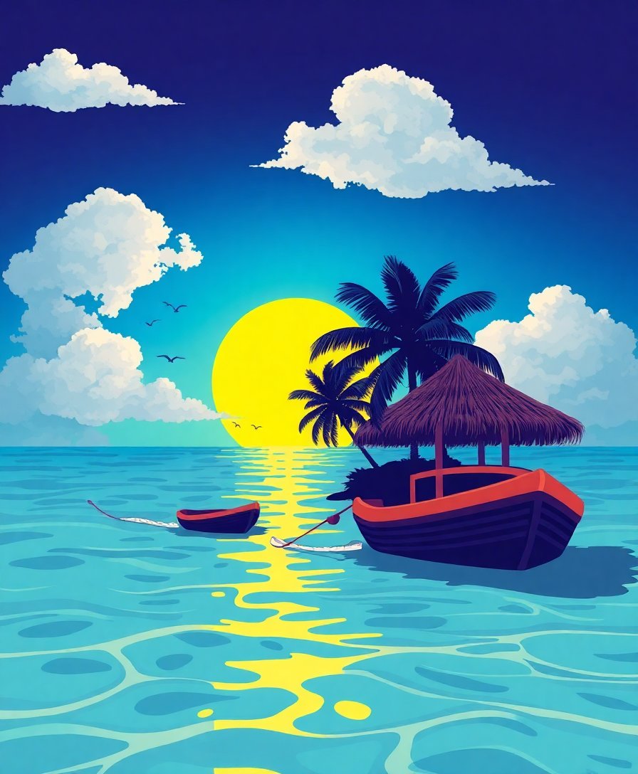 The molten vinyl records and retro sunglasses capture authentic seventies culture perfectly. This tropical-themed artwork celebrates iconic vintage vinyl aesthetics with stunning visual appeal.