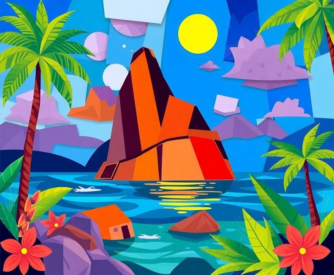 Create your own tropical cubist sanctuary today. Let the interplay of light, shadow, and geometric beauty transport you to an island paradise where art meets relaxation.