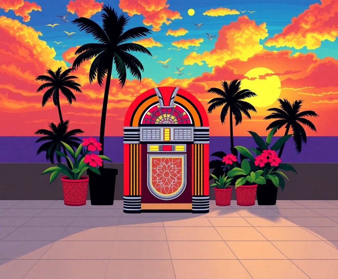 Ultimately, watch as your beachside jukebox scene comes alive with vibrant colors and nostalgic charm. The finished piece captures the essence of 1950s pop culture against a stunning tropical backdrop.