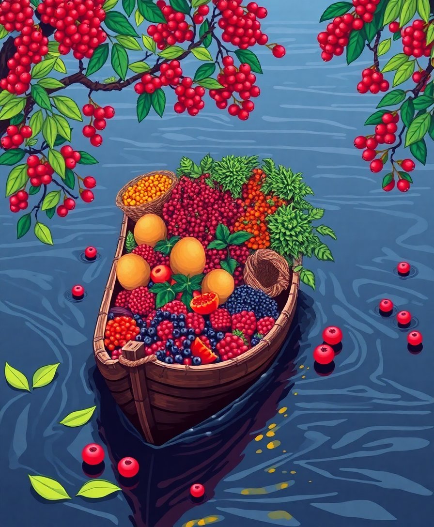 Transform your creative space with this stunning Jungle Berry Boat Cargo Paint By Numbers masterpiece. This enchanting design captures the rustic charm of a wooden boat overflowing with vibrant berries and botanical treasures. Moreover, the detailed composition brings together natural elements in a captivating autumnal scene.