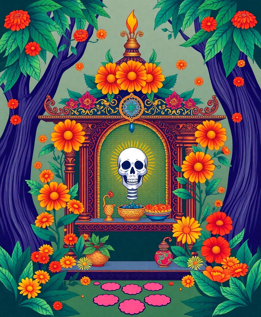 Ultimately, step back and admire your completed masterpiece. The rich marigold hues and brass shrine details create stunning visual impact. Your finished artwork celebrates both artistic achievement and cultural appreciation.