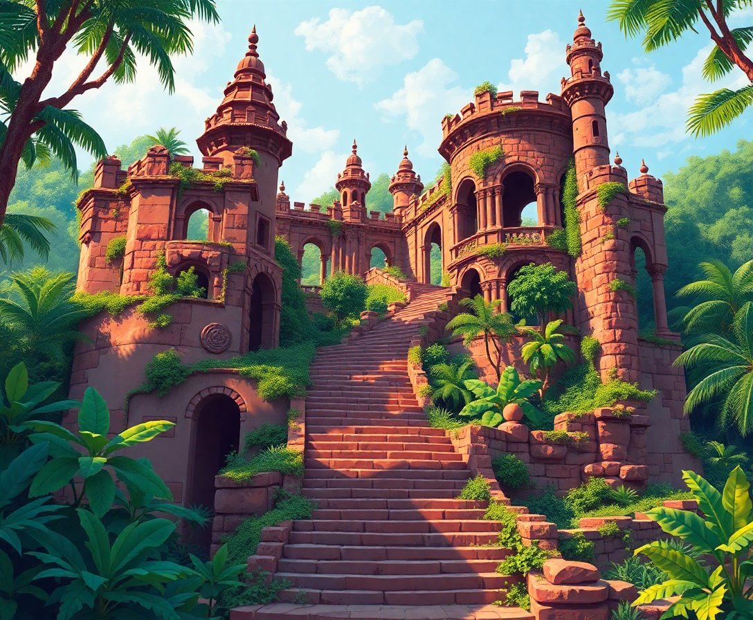 Transform your space with this captivating Jungle Palace Stairway Ruins Paint By Numbers artwork that brings ancient architectural beauty to life. This stunning kit captures the mystique of weathered stone steps ascending through lush tropical foliage, where golden sunlight filters through dense jungle canopy.