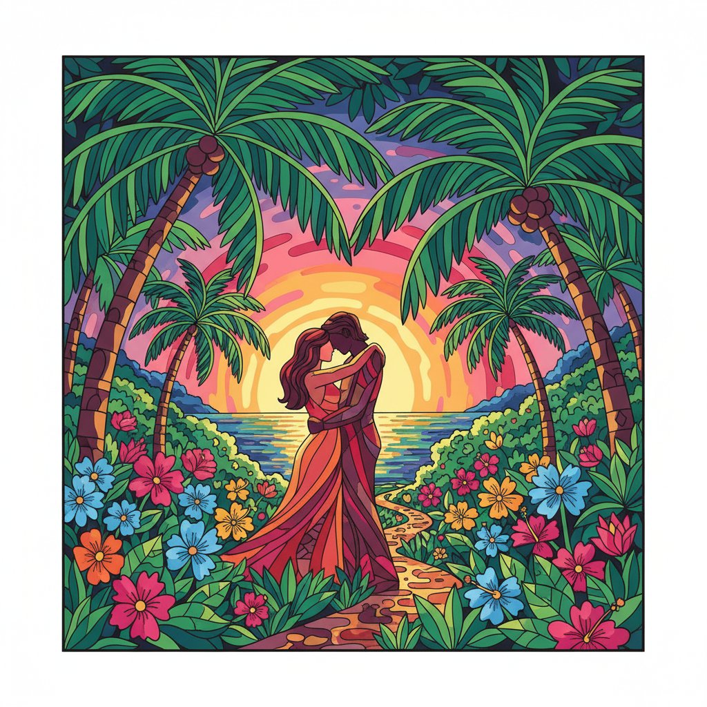 Ultimately, complete the intimate embrace scene by adding final touches to shadows and highlights. Your finished masterpiece will showcase the timeless beauty of love beneath swaying palms, ready for display.