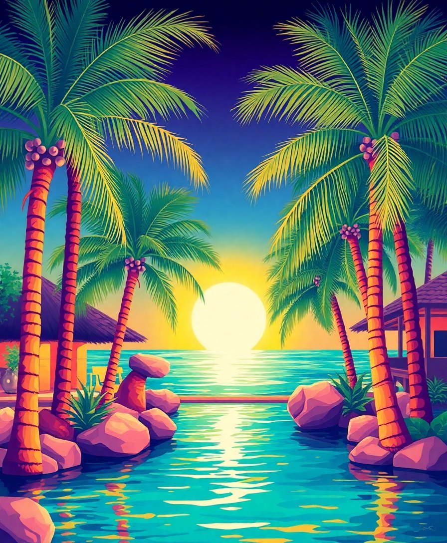 Ultimately, step back and admire your glowing masterpiece. Additionally, the nighttime lagoon scene will captivate viewers with its realistic beauty. Your beach coastal artwork is now ready for display.