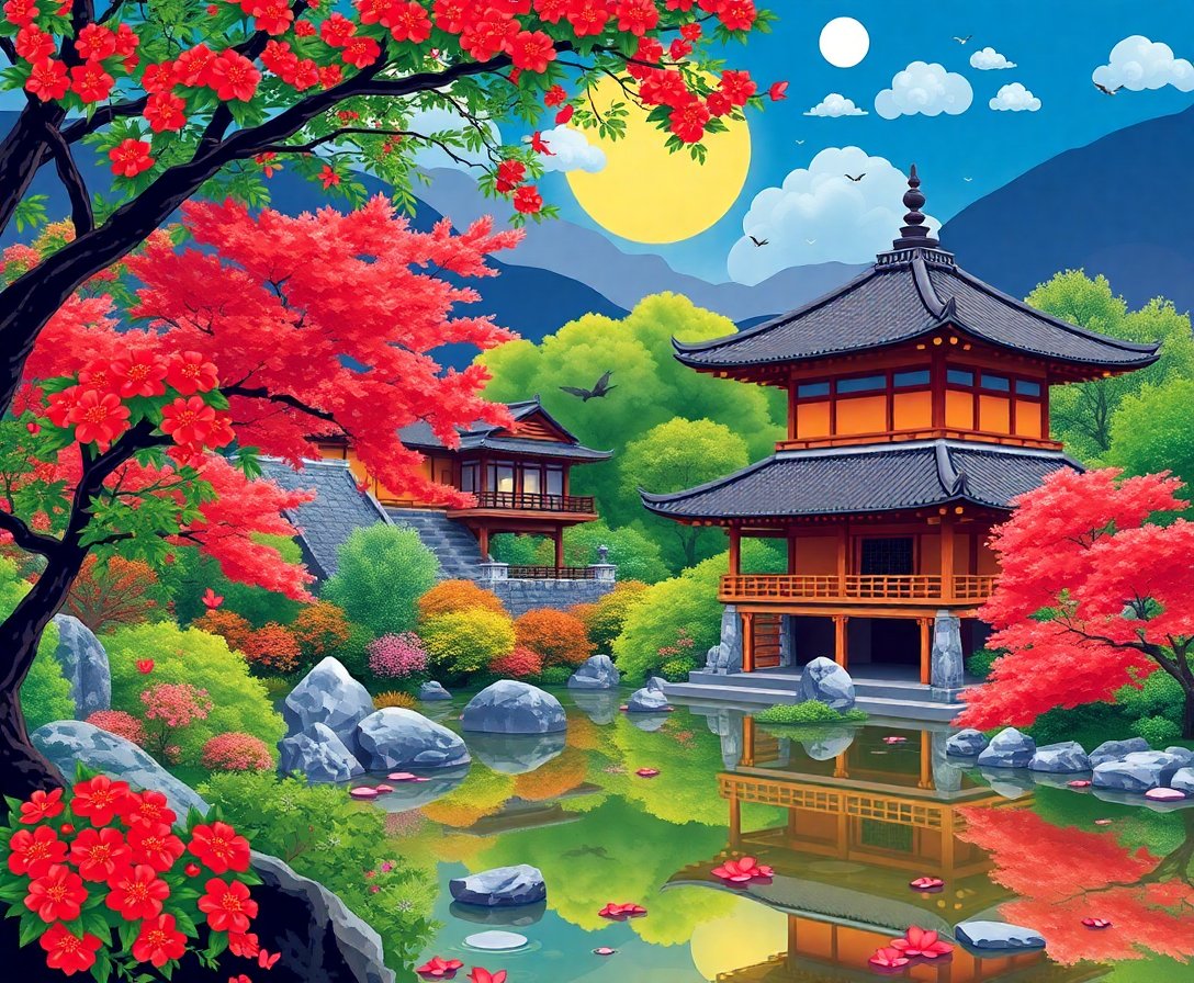 The high-quality linen canvas measures 16×20 inches, perfect for displaying in any room. The finished artwork creates a striking focal point that captures authentic Japanese garden beauty.