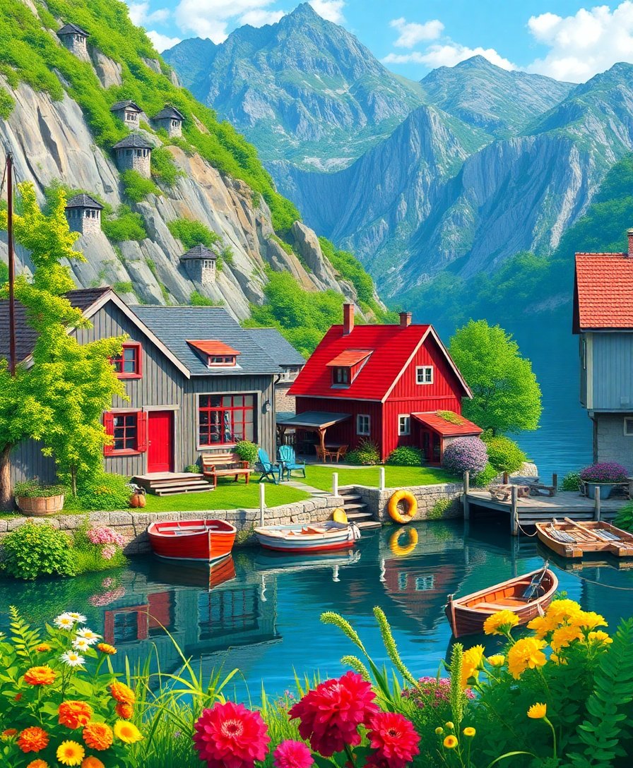 Transform your living space with this breathtaking Lush Fjord Summer Retreat Paint By Numbers masterpiece. This stunning landscape captures the serene beauty of Nordic wilderness. Experience the therapeutic joy of creating your own Scandinavian fjord village artwork.