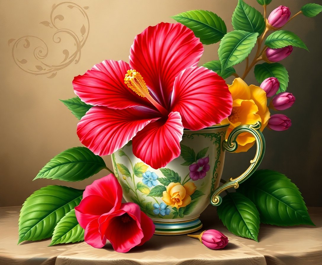 Ultimately, witness your tropical hibiscus creation come alive with vibrant colors. Display your finished classical still life artwork proudly. The antique teacup design adds sophisticated elegance to any room’s decor.
