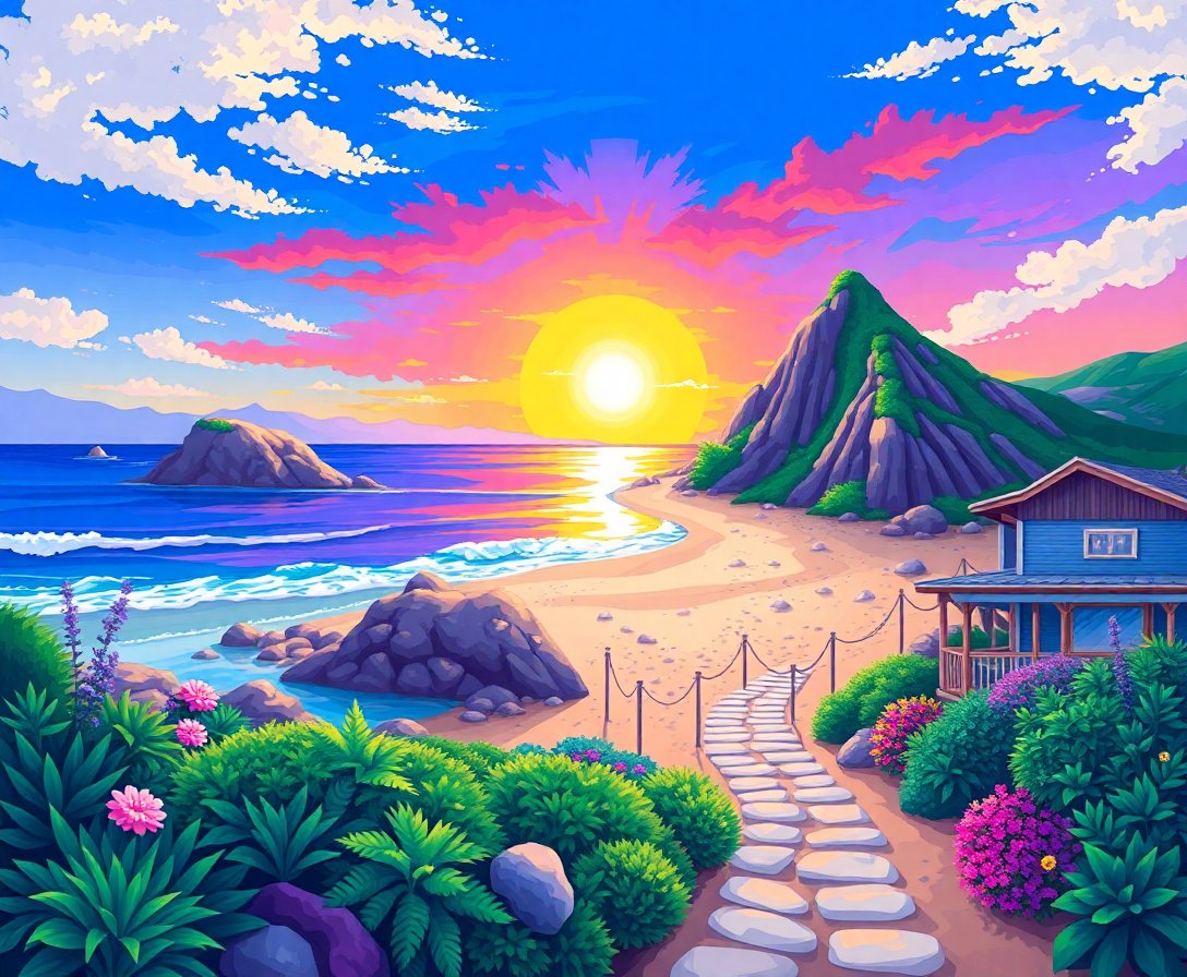 Transform your space with this breathtaking Lush Peaks Beach Retreat Paint By Numbers masterpiece. This stunning tropical villa scene captures the essence of paradise. Each brushstroke brings you closer to creating your own seaside sanctuary.