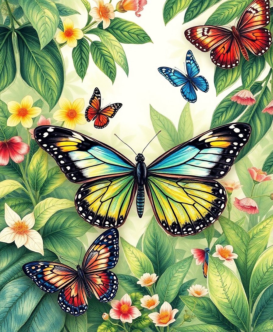 The realistic lepidoptera and lush greenery create an immersive rainforest experience. The emerald color palette and sketchbook aesthetic deliver professional-quality results perfect for any decor.