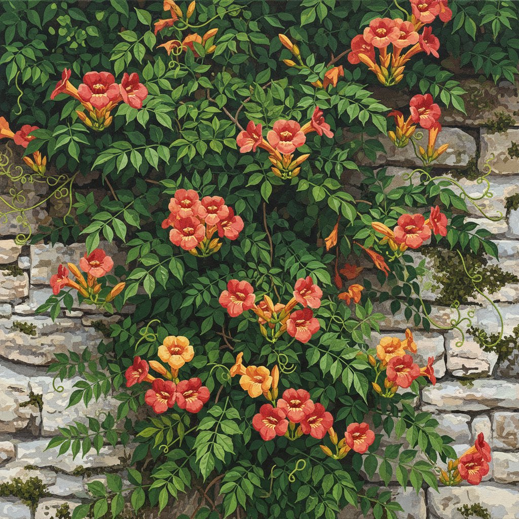 The realistic trumpet vines showcase vibrant orange blooms against weathered architecture, creating a stunning overgrown garden effect. This botanical spring design captures nature’s beauty in remarkable detail.