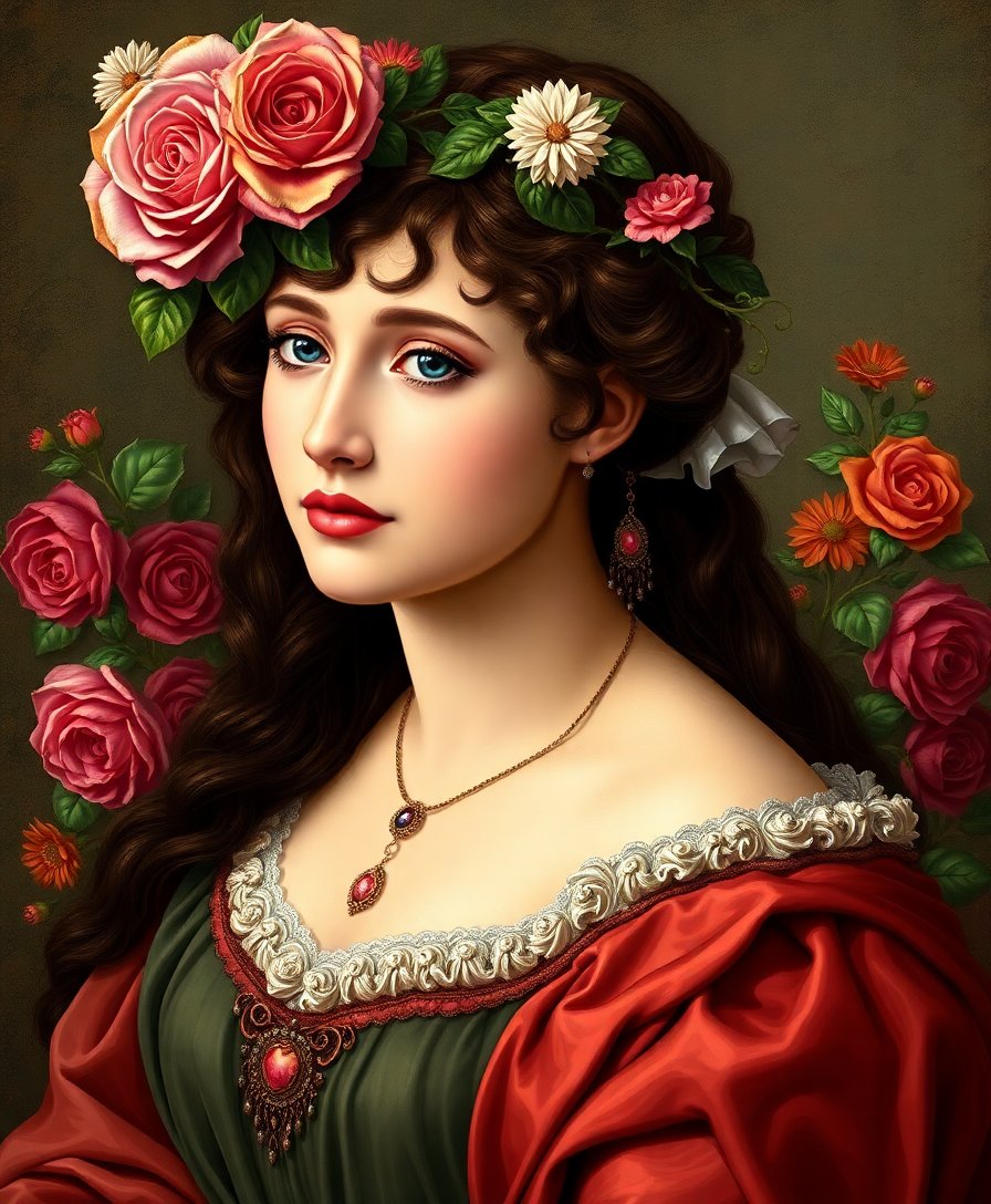 The intricate details capture classical portraiture techniques with emerald and vintage color schemes. The mysterious expression and tropical elements create a unique blend of historical and contemporary artistic appeal.